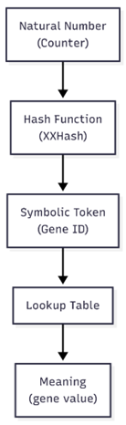 The mechanics here are straightforward, but the consequences are not. When a gene is added, a counter is incremented if we need a new encoding. The value of the counter is given to a 64-bit Hash function XXHash to generate its hash token. The hash function is noncryptographic and is used as a unique identifier to look up mappings.  The hash can then be used as the identifier to “decode” the encoding back to its value. So, gene encodings are essentially hashes of natural numbers in ascending order. The hash is used purely as a unique identifier for efficient lookup; decoding is performed via an internal mapping, not by inverting the hash.