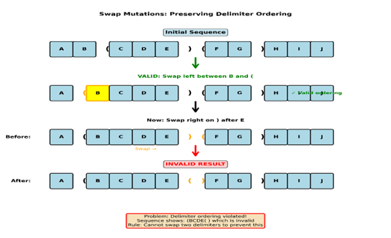 Say we have sequence AB(CDE)(FG)HIJ and a swap mutation is triggered on the first (between B and C, it’s a swap to the left again. The resulting sequence would be A(BCDE)(FG)HIJ this is a valid swap mutation. Now let’s say another swap mutation occurs on the delimiter after E and it’s to the right the resulting solution would be A(BCDE()FG)HIJ this results in an invalid ordering of delimiters because we have (content(), which is a violation of delimiter ordering, which is why the swap rules forbid swapping two delimiters; to preserve ordering.