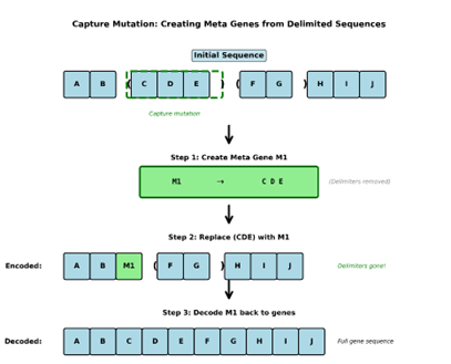 Let’s consider AB(CDE)(FG)HIJ again. If there is a capture mutation anywhere in the (CDE) sequence a new metagene M1 is created, and the new sequence would become AB M1 (FG)HIJ, which at evaluation would decode to ABCDE(FG)HIJ. Notice the ( ) that encapsulated CDE are not present, yet the gene sequence ABCDEFGHIJ remains intact. It’s also worth noting that decoding sequences in MEGA can optionally be set to return delimiters that haven’t been captured yet in the decoded solution. So, the decoded solution could also be ABCDE(FG)HIJ.