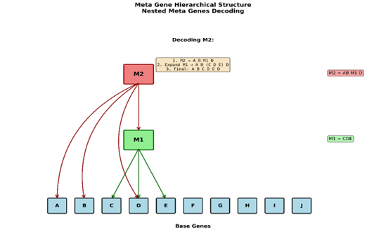When the algorithm is first initialized, we have: (let’s use our base gene set from above ABCDEFGHIJ). Next our example captured a new metagene M1 which is composed of CDE and that is where we stopped. It was mentioned that metagenes can then be nested within other metagenes through usage, but we didn’t have a specific example. So, let’s say that a new delimited sequence forms, consisting of (AB M1 D) which is captured and creates a new metagene M2 composed of AB M1 DNote: I’m using the real values of the genes and not their encodings for simplicity.