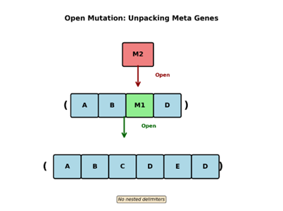Open is exactly the inverse operation of capture. Take the M2 metagene that we have been working with for a while now. If an open mutation triggers on top of it, the capture sequence is reversed only on that individual occurrence of M2. The sequence is unpacked, and delimiters are placed around it, creating the sequence (A B M1 D). which if you remember decodes back to ABCDED. Now since this has a nested metagene within it, if another open mutation were to occur on M1, it would be unpacked back to CDE. However, in this case delimiters are not included to preserve our no nesting of delimiters rule. That’s it there is nothing else that Open does except undo the capture mutation.