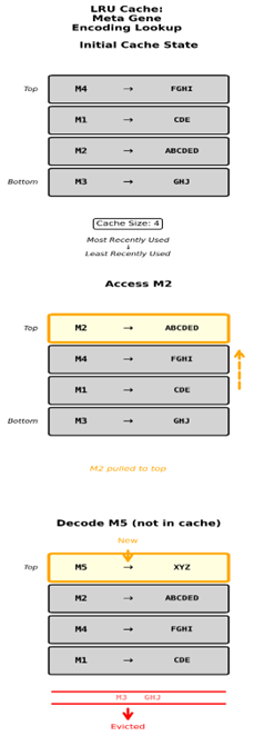 So, the LRU Cache can be thought of as a stack of Encodings and the values that they map back to. Each time an encoding is used, if it is in the Cache, it gets pulled from its position in the stack and moved to the top of the stack. So, at any given time the stack reflects an ordering of metagenes from the most recently used down to the least recently used. If there are more metagenes than the LRU has size to accommodate when a metagene outside of the LRU is decoded, we need to go through the algorithmic decoding process described above to get its decoded value which is expensive. That encoding and its decode value are then put on the top of the Cache and the bottom element falls out.